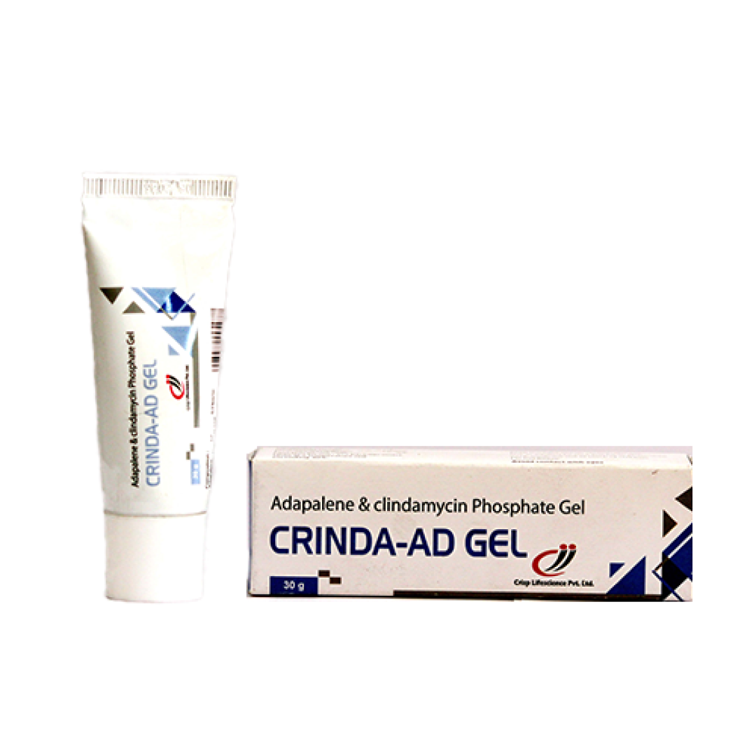 Crinda-AD Gel is a topical medication designed to effectively treat acne by combining the keratolytic action of Adapalene with the antibacterial properties of Clindamycin. This dual-action formula reduces acne lesions, prevents new breakouts, and helps clear existing pimples.